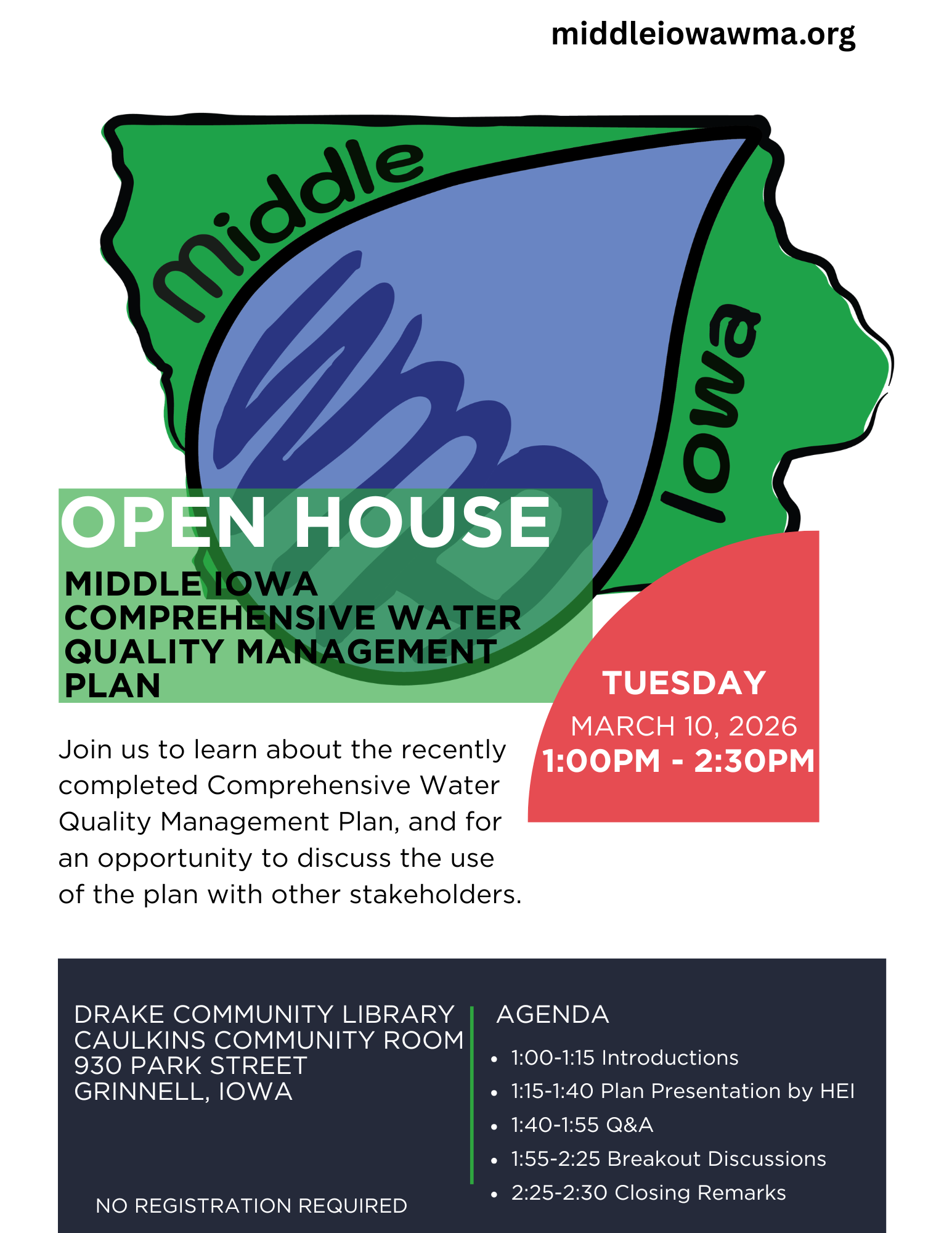 The Middle Iowa Comprehensive Water Quality Plan is ready for its public reveal! This event will be held at the Drake Community Library in downtown Grinnell.